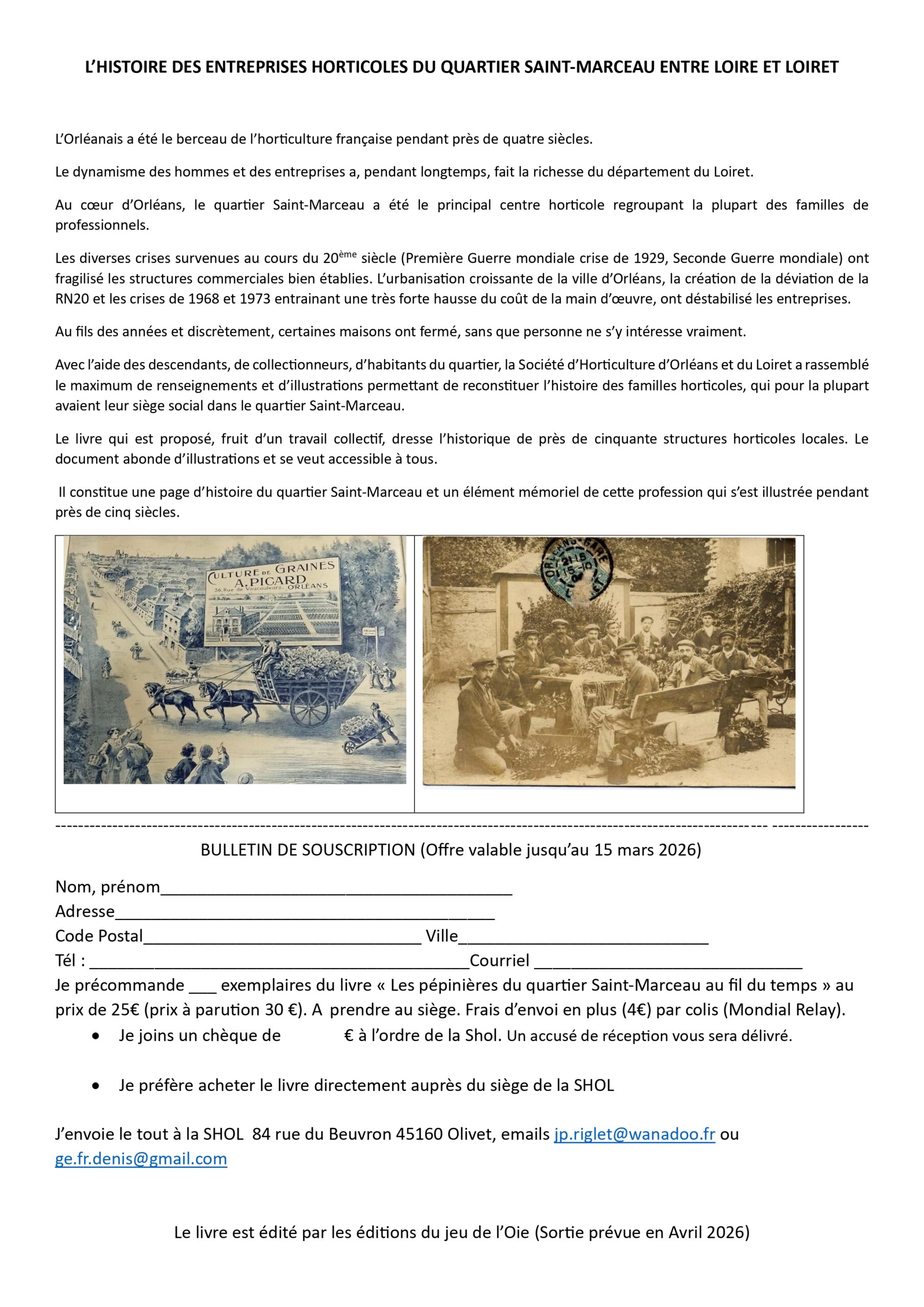 Avec l’aide des descendants, de collectionneurs, d’habitants du quartier, la Société d’Horticulture d’Orléans et du Loiret a rassemblé le maximum de renseignements et d’illustrations permettant de reconstituer l’histoire des familles horticoles, qui pour la plupart avaient leur siège social dans le quartier Saint-Marceau.