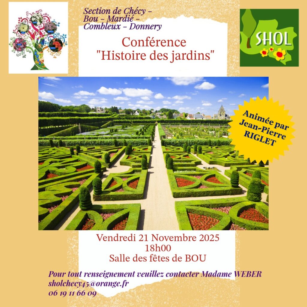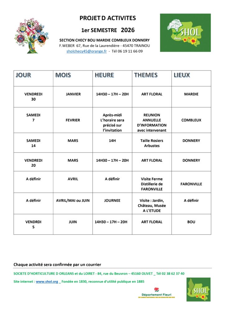 La section de Chécy-Bou-Mardié-Combleux-Donnery propose aux adhérents de nombreuses activités au fil des mois : Art Floral – Conférences – Visites et voyages découverte de sites d’exceptions – Taille des arbres fruitiers – des arbustes – Bourse d’échange de plantes, de savoir et de saveurs. Toutes ses activités sont proposées par les bénévoles adhérents à la Société d’Horticulture d’Orléans et du Loiret.