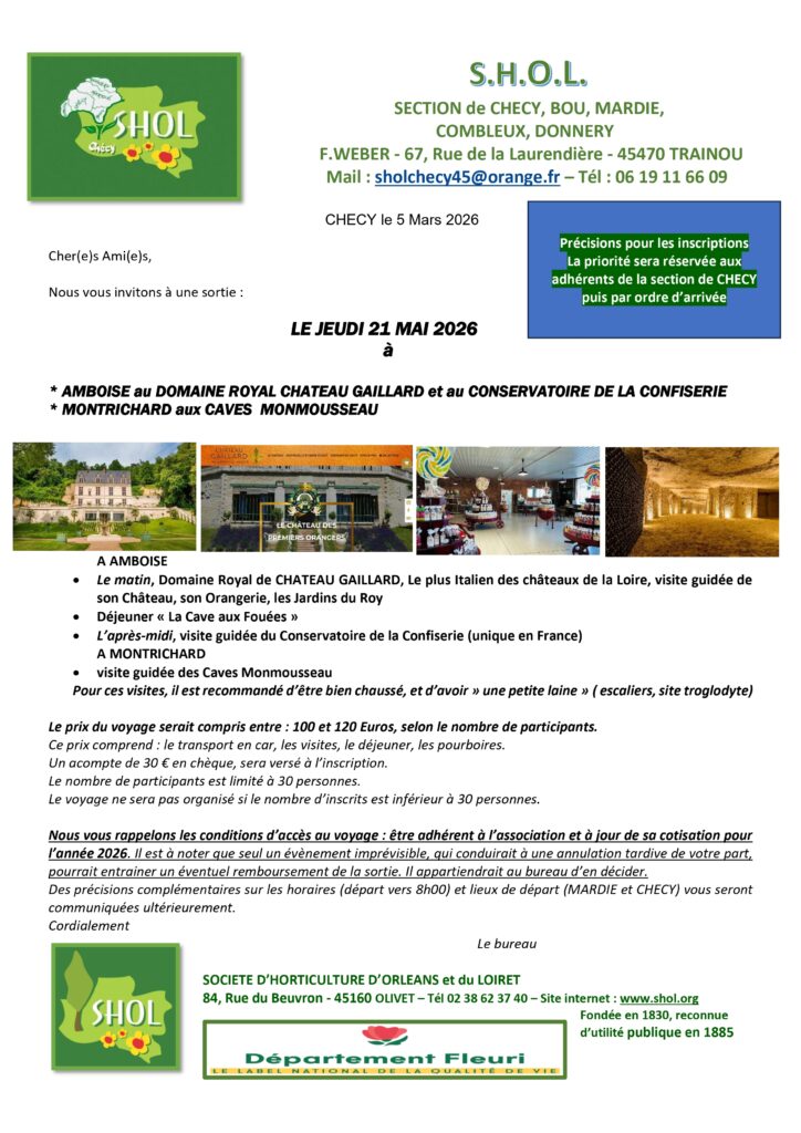 La section de Chécy-Bou-Mardié-Combleux-Donnery propose aux adhérents de nombreuses activités au fil des mois : Art Floral – Conférences – Visites et voyages découverte de sites d’exceptions – Taille des arbres fruitiers – des arbustes – Bourse d’échange de plantes, de savoir et de saveurs. Toutes ses activités sont proposées par les bénévoles adhérents à la Société d’Horticulture d’Orléans et du Loiret.